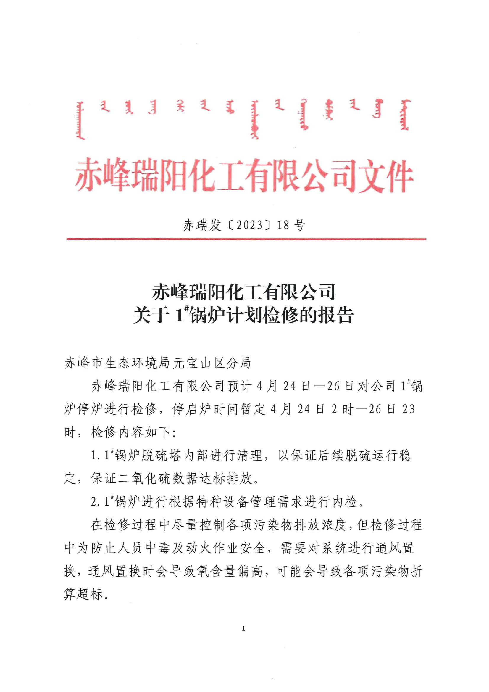 赤峰瑞陽化工有限公司1#鍋爐計劃檢修報告